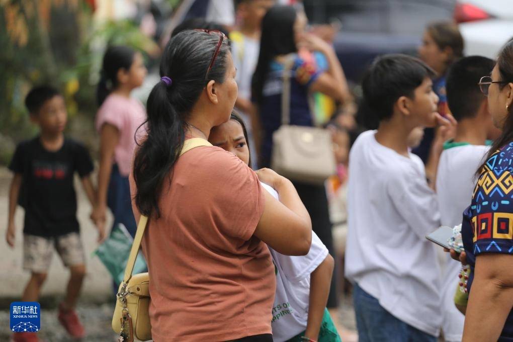 10月10日,在菲律宾达沃市,人们从一所学校内疏散至室外。